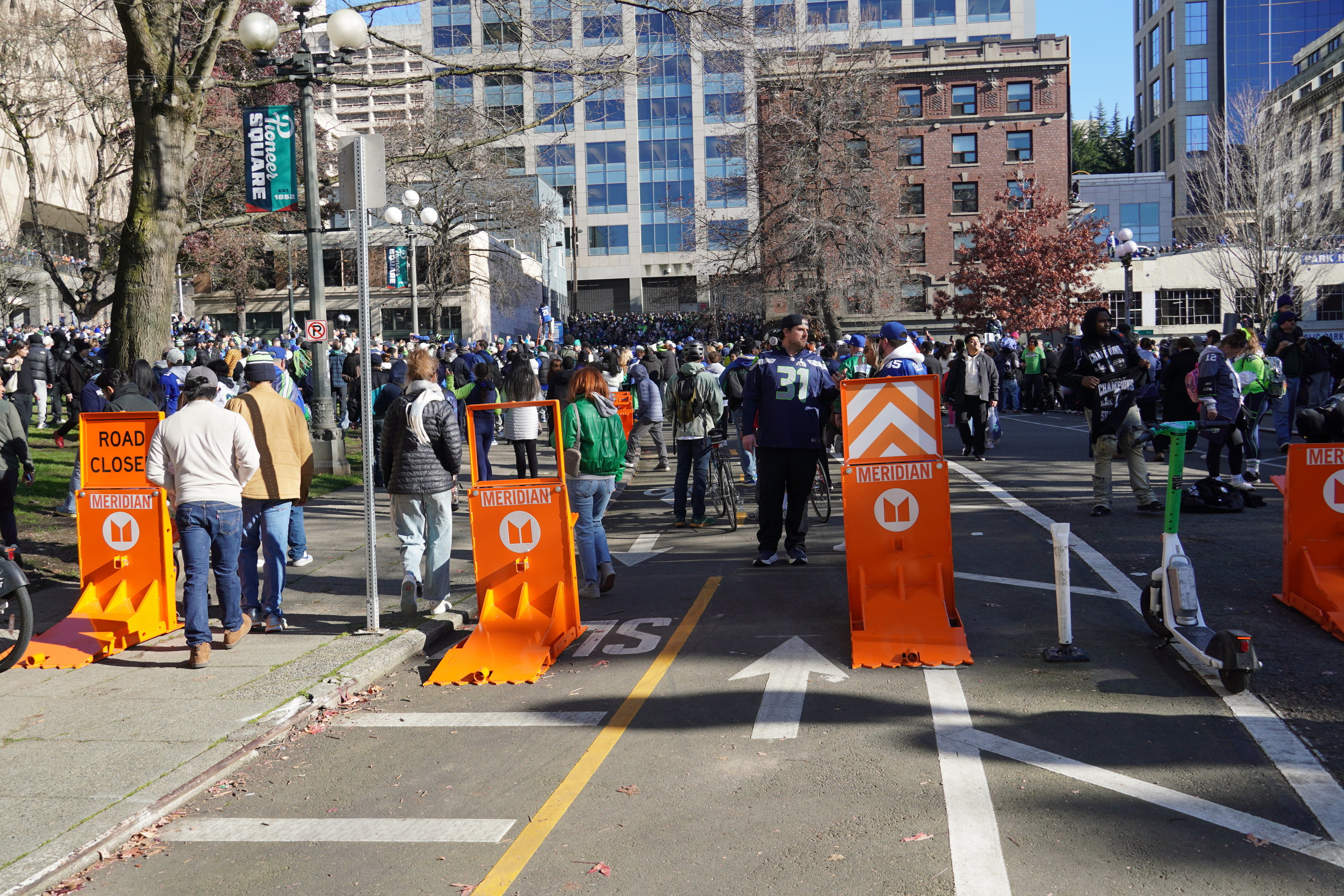 Meridian worked closely with city officials and security teams supporting the Seattle Seahawks to ensure fans could safely enjoy the historic celebration. Meridian’s mobile barriers and gates have been regularly deployed for several years at Lumen Field on game days, but this marked the first time the company’s systems were used across such a large footprint throughout Seattle.